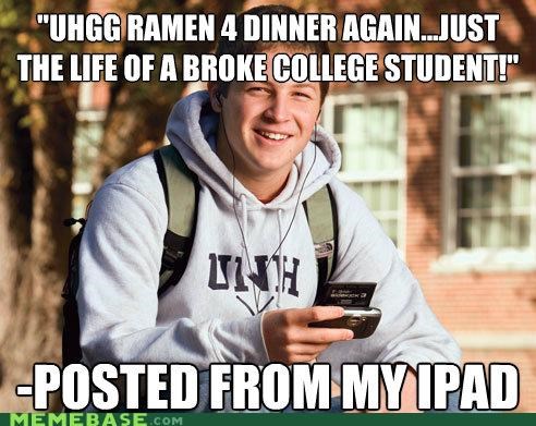 These college memes will make you realize just how bad it can get and also make you remember you re not the only one feeling that way. So we determined that most of students are broke or on the verge of being broke but they don t complain about it or they do. Their students took offensive at posts that were considered distasteful. But for others this was just another reminder of how being broke in a community of wealthy students is more than just a silly meme. What make you a college student. Looking for the most relatable memes for broke college students. 10 things you learn when you re broke.