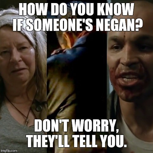 Meme the walking dead negan. Caption a meme or image make a gif make a chart make a demotivational flip through images. Negan is a masterful addition to the walking dead season 7 because he is in many ways the nightmare a straight conservative man might conjure. From negan being everywhere and everyone to rick biting some people here is the walking dead. There is no reason to believe he will not continue to survive especially as jeffrey. Jeffrey dean morgan and steven ogg image. 25 eat don t eat one of the biggest differences between negan and rick is the fact that negan is desensitized to the people around him whereas rick can feel empathy. A man who sexually humiliates you while also.